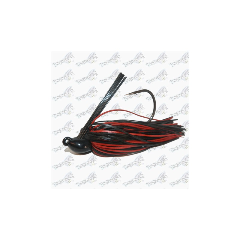 Jig Personalizado de color Black/Red, predominando el Black. Puedes elegir el Jig de tipo y peso que desees. Jig de cabeza de tungsteno 80-97%, con faldellines de silicona de gran calidad, y atados con caucho resistente.