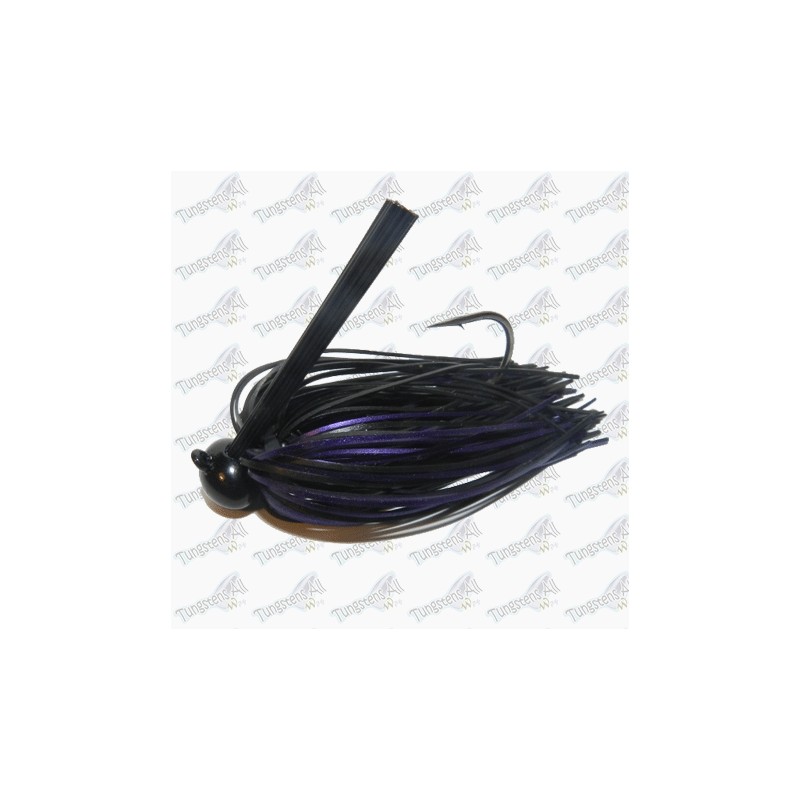Jig Personalizado de color Black Mortal/Morado Metalico, predominando el Black Mortal. Puedes elegir el Jig de tipo y peso que desees. Jig de cabeza de tungsteno 80-97%, con faldellines de silicona de gran calidad, y atados con caucho resistente.
