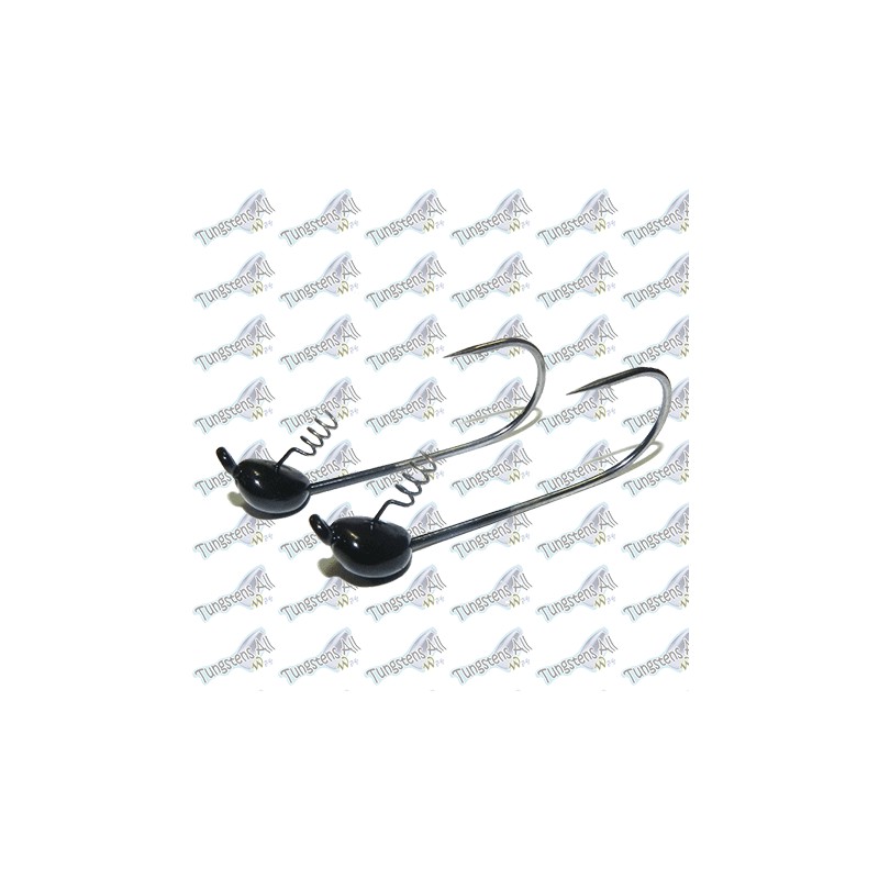 La cabeza compuesta con un 97% de tungsteno recibe un diseño curvado y contornos redondeados facilita la pesca en zonas con vegetación. Montado sobre un anzuelo Mustand 4/0 de calidad Premium con una inclinación a 60º y un muelle fino y largo totalmente moldeable de acero inoxidable, diseñado para introducir el señuelo fácilmente.