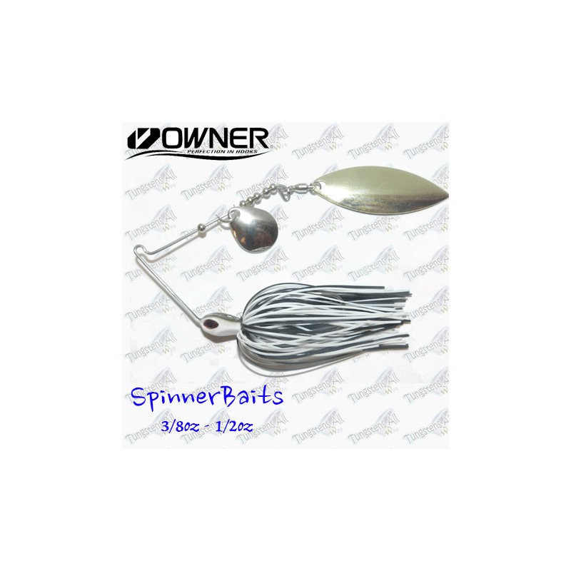 Spinnerbaits con cuerpo de Tungsteno 97% y alambre, con 2 palas ovaladas(Tipo Indiana). El Tungsteno hace que el señuelo sea mucho mas discreto y pequeño, cabeza de color blanco y negro, y acompañada de faldellines de silicola de gran calidad. Anzuelo Onwer