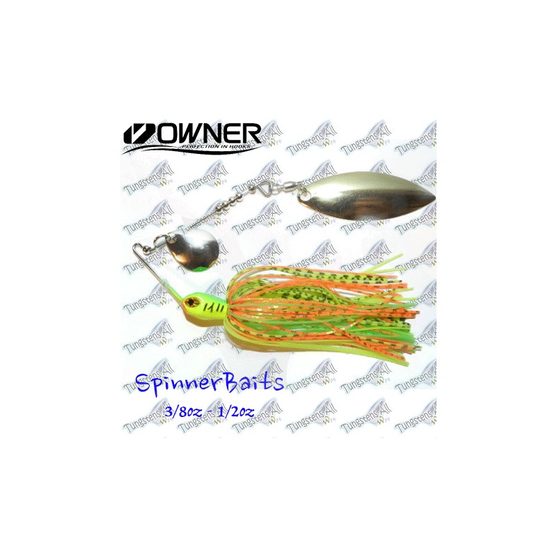 Spinnerbaits con cuerpo de Tungsteno 97% y alambre, con 2 palas ovaladas(Tipo Indiana). El Tungsteno hace que el señuelo sea mucho mas discreto y pequeño, cabeza de color blanco y negro, y acompañada de faldellines de silicola de gran calidad. Anzuelo Onwer