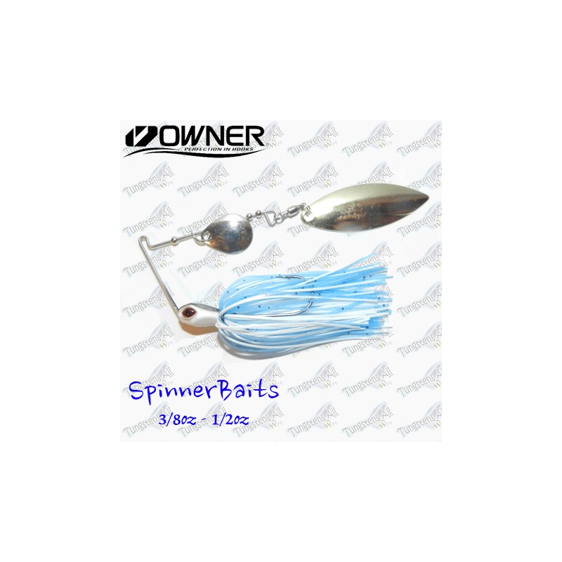 Spinnerbaits con cuerpo de Tungsteno 97% y alambre, con 2 palas ovaladas(Tipo Indiana). El Tungsteno hace que el señuelo sea mucho mas discreto y pequeño, cabeza de color blanco y negro, y acompañada de faldellines de silicola de gran calidad. Anzuelo Onwer