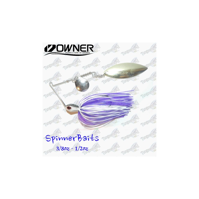 Spinnerbaits con cuerpo de Tungsteno 97% y alambre, con 2 palas ovaladas(Tipo Indiana). El Tungsteno hace que el señuelo sea mucho mas discreto y pequeño, cabeza de color blanco y negro, y acompañada de faldellines de silicola de gran calidad. Anzuelo Onwer