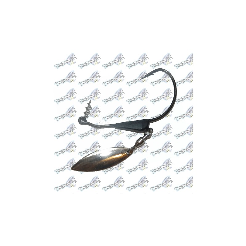 Anzuelo curvo Mustad 3/0 con peso de Tungsteno de 5,30gr color negro. Combinado con una pala de color plata para resaltar el señuelo y hacer destellos en su carrera, tambien se añade una espiral en el anzuelo para sujetar perfectamente el señuelo.