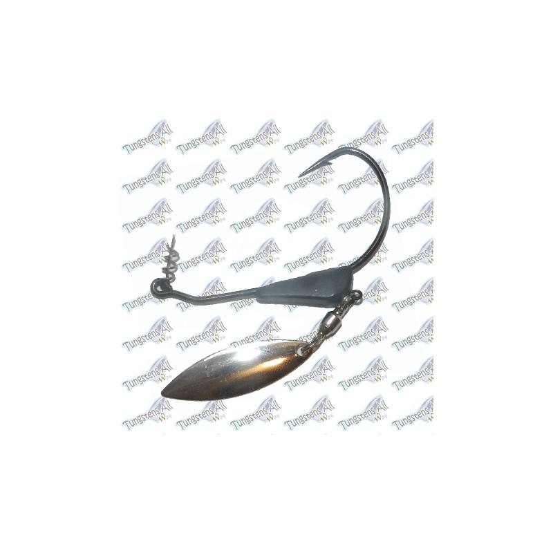 Anzuelo curvo Mustad 3/0 con peso de Tungsteno de 7gr color negro. Combinado con una pala de color plata para resaltar el señuelo y hacer destellos en su carrera, tambien se añade una espiral en el anzuelo para sujetar perfectamente el señuelo.