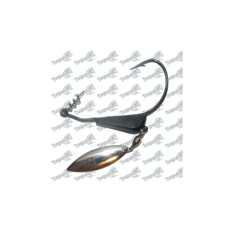 Anzuelo curvo Mustad 4/0 con peso de Tungsteno de 14gr color negro. Combinado con una pala de color plata para resaltar el señuelo y hacer destellos en su carrera, tambien se añade una espiral en el anzuelo para sujetar perfectamente el señuelo.